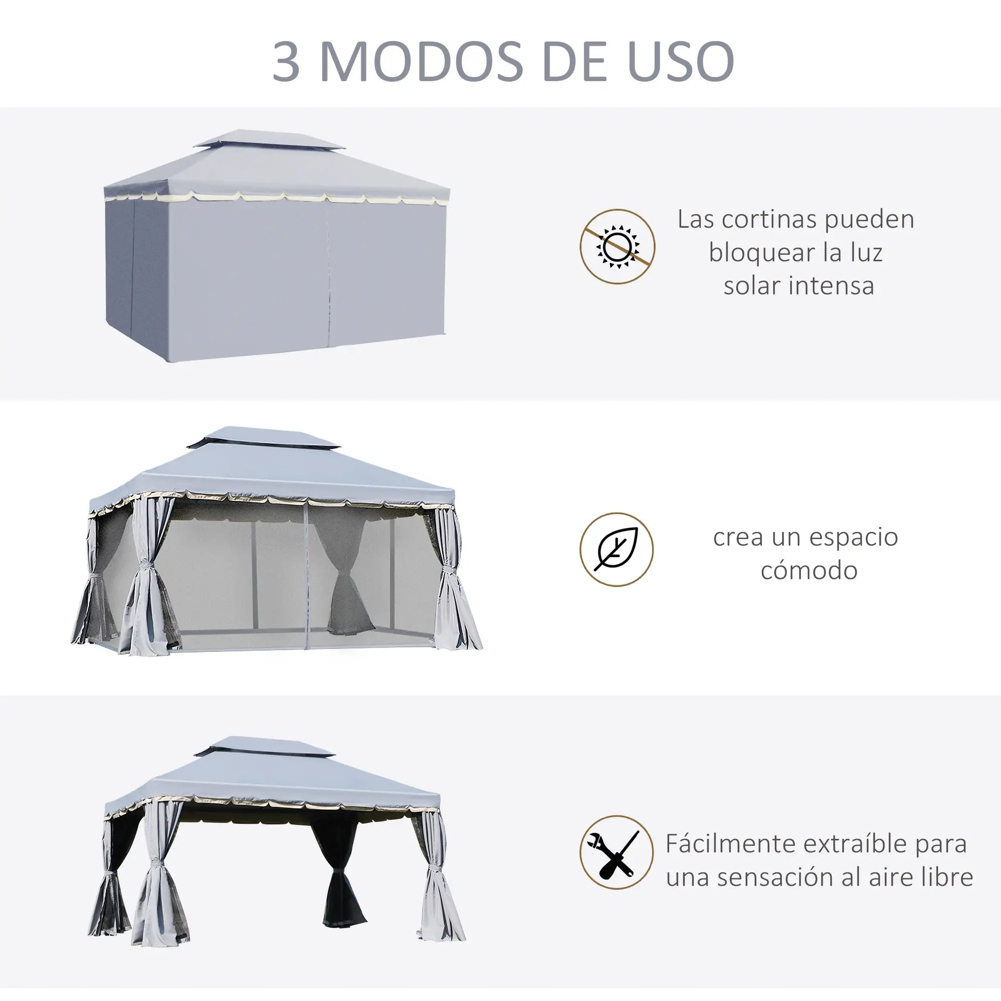 Amplio, moderno y funcional, es perfecto para reuniones, comidas o simplemente relajarte al aire libre sin preocuparte por el sol o el viento.